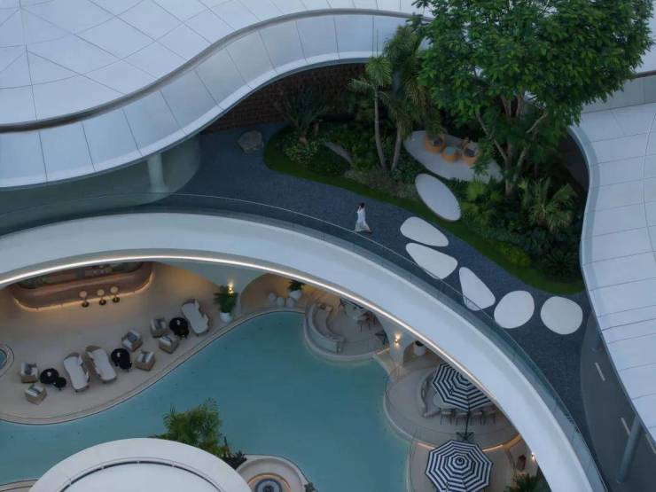 迪拜风情的社区会所——海晏艺术会所以文艺复兴时期的著名画作《维纳斯的诞生》为灵感,巧妙地将花雨艺术符号贯穿整个设计之中,成功打造了一个融合了文艺复兴韵味与自然人文氛围的独特空间。会所的外观设计采用了白色曲线拱券风格,中间穿插着泳池,蓝白相间的色彩搭配营造出一种宁静而放松的氛围。作为国内首家引入迪拜风情设计的社区会所,它不仅带来了同纬度地区的气候特点,还增添了一抹异国情调。