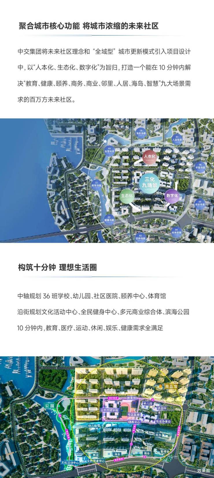 为赋新城市而来,中交·蓝色港湾将承担自贸岛商旅文创、活力休闲、滨海居住等功能,构筑十五分钟生活圈,涵盖中小学校、运动场所、社区医院、养老院、图书馆、综合服务中心、商业设施、银行网点、垃圾转运站、公交车站等。