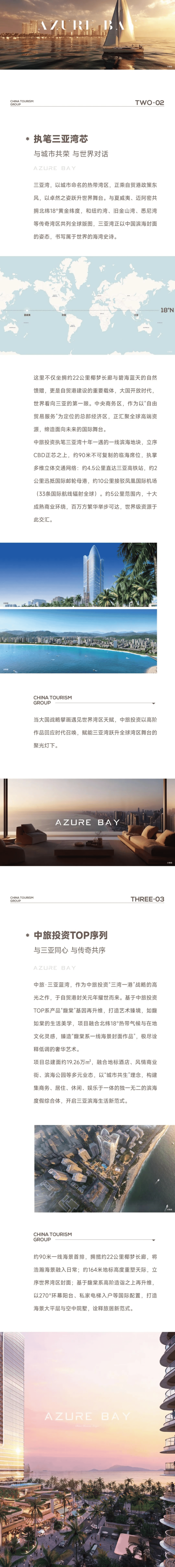 中旅投资是中国旅游集团八大重点战略业务之一,也是国务院国资委确认的以房地产开发为主业的中央企业。作为唯一将总部迁至三亚的中央房企,中旅投资致力于成为具有卓越影响力的城市地产开发运营服务商。在海南“全岛封关运作”的历史机遇下,构建与国家战略同频共振的三湾一港海南城市版图,彰显建设新时代海南自由贸易港的央企担当。