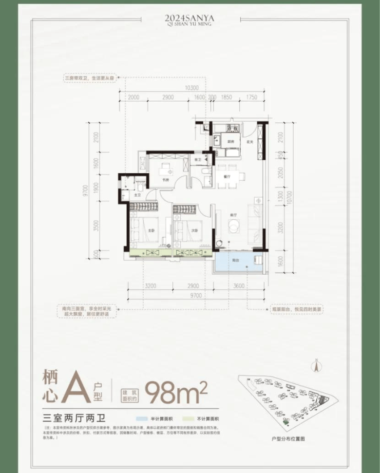 A户型:建面约98㎡,三房两厅两卫(78套)。南向三面宽,超宽景观阳台,卧室带超大飘窗,居住更舒适。