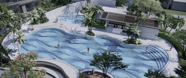 项目将岛屿、雨林、礁石、沙滩、椰风五重海景元素赋予场地景观,规划围合式超大央景花园、超 500㎡阳光泳池、全龄架空层,营造社区活力生活场景。
