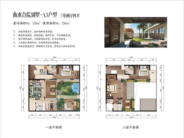 A1留云小院,套内面积约76㎡,使用面积约128㎡,220万起,两房两厅三卫,可改三房,海南稀缺小别墅,独门独院设计,一层大面积私家庭院,带温泉泡池,半敞开客厅,双卧套间。
