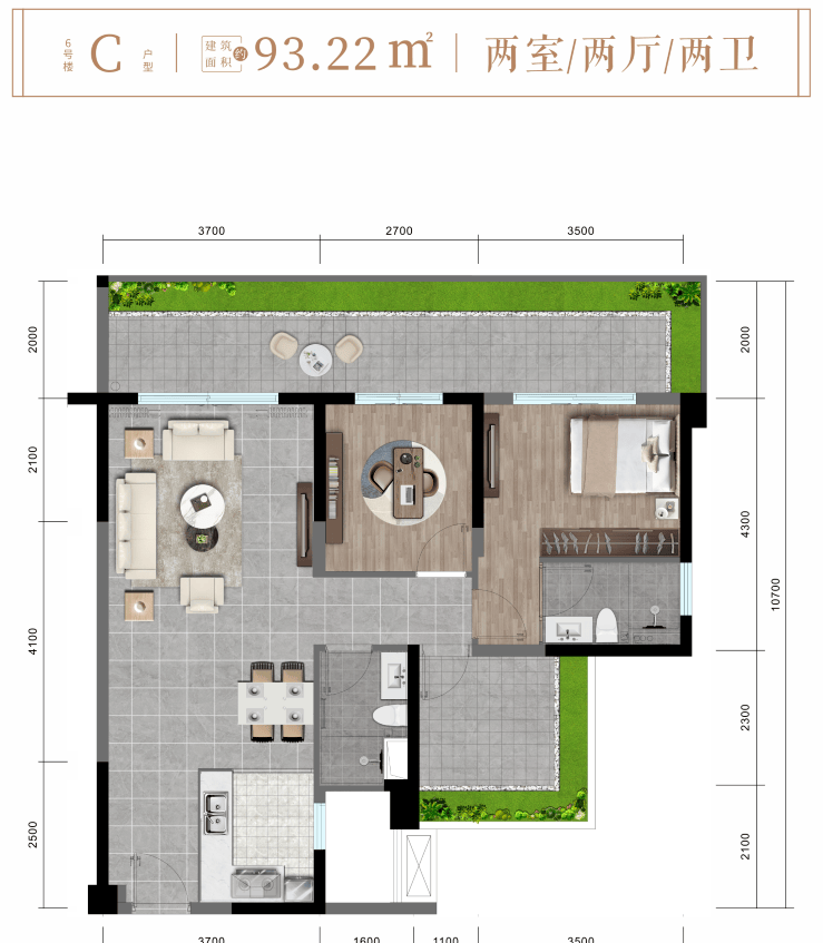 C户型约93㎡舒阔两房两厅两卫