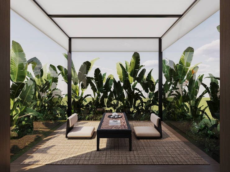 园林设计以杭州法云安缦为蓝本,师法自然、禅意幽远。悉心挑选 40 种热带特色植被,葱郁繁茂、四季繁花。更珍视原地块 4 棵百年古树,以此为核心景观节点,古木参天、岁月沉淀,与新植交相辉映,构筑宁静深邃、自然野趣的园林画卷,让每一步归家皆为穿越诗意秘境的悠然旅程。