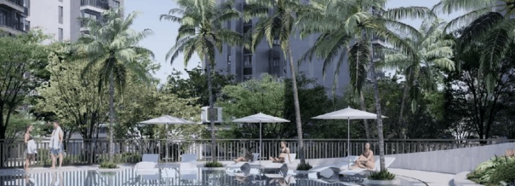 项目将岛屿、雨林、礁石、沙滩、椰风五重海景元素赋予场地景观,规划围合式超大央景花园、超 500㎡阳光泳池、全龄架空层,营造社区活力生活场景。
