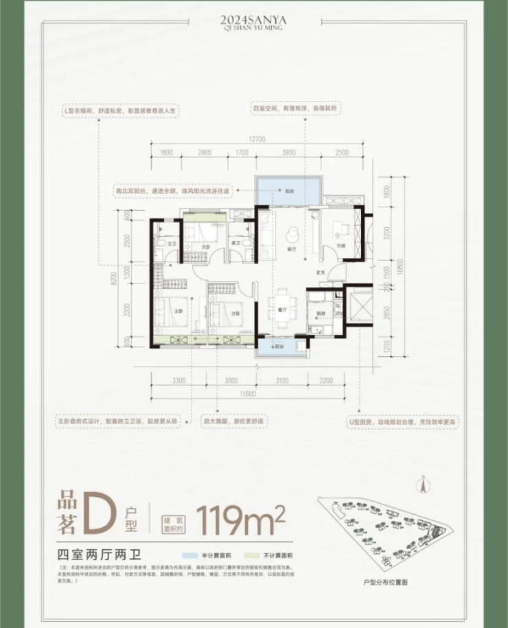 D户型:建面约119㎡,四房两厅两卫(658套)。科学布局空间,有理有序,南北双阳台、U型厨房、主卧套房式设计,舒适且私密。