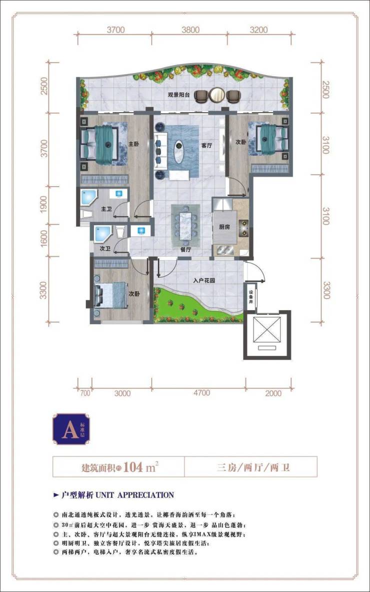 新推2期A户型建面约104㎡三房两厅两卫户型 30㎡前后超大空中花园,进一步赏海天盛景,退一步品山色蓬勃;主、次卧、客厅与超大景观阳台无缝衔接,纵享IMAX级景观视野,明厨明卫,独立客餐厅设计,为塔尖峰层造就天际云间的奢华会客厅。