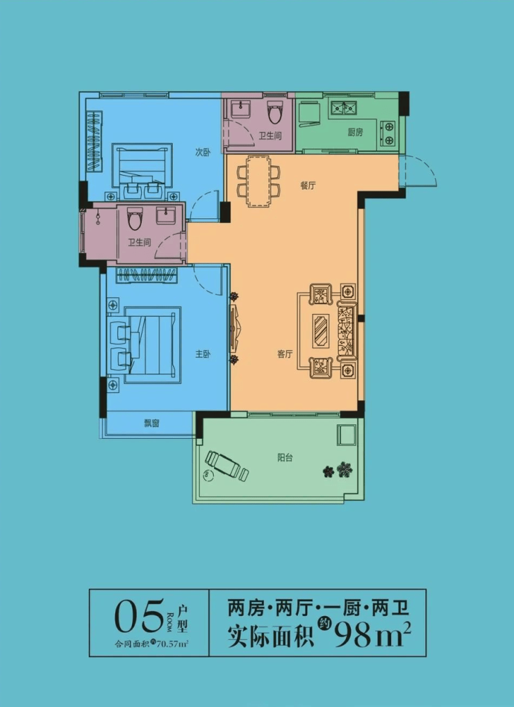 建筑面积:70平米,实得面积98平米南北各一个卧室