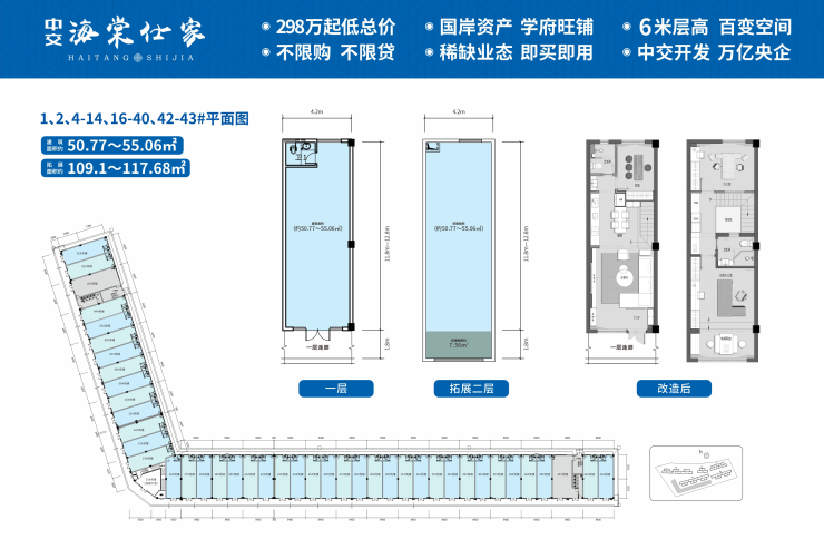 建筑面积约50-480㎡,享11.8-12.8m高功能型进深,4.2-8.4m敞阔开间,首层6m性价比大挑高,后期可改造loft,一层商铺,二层自住,陪读、投资两全。