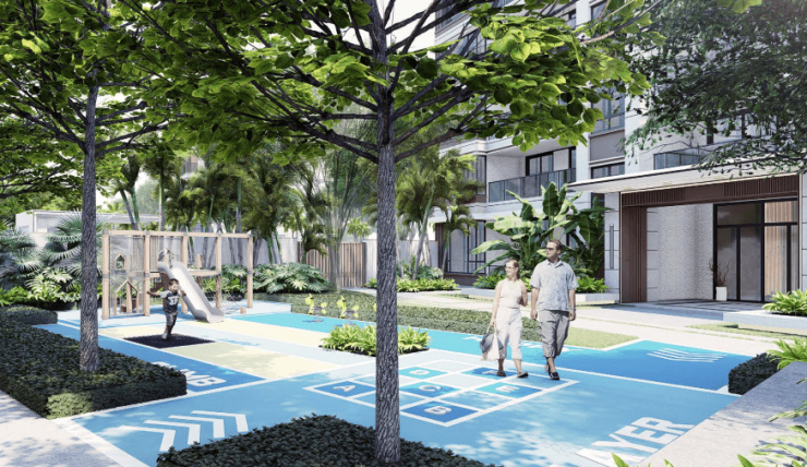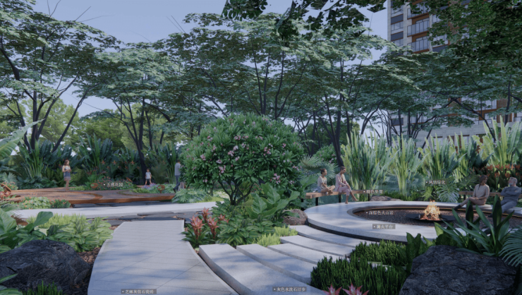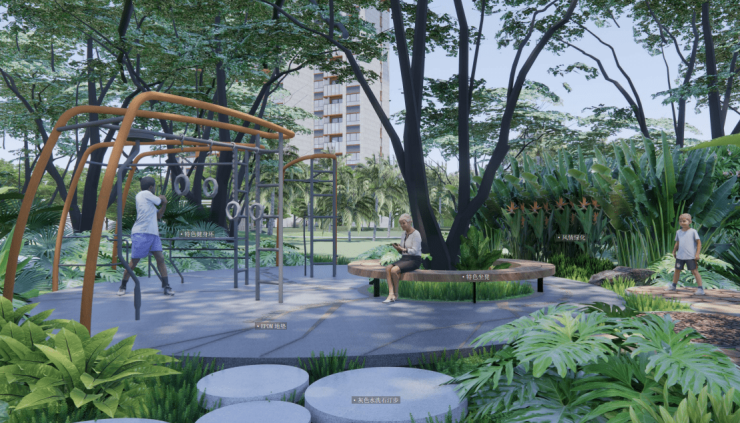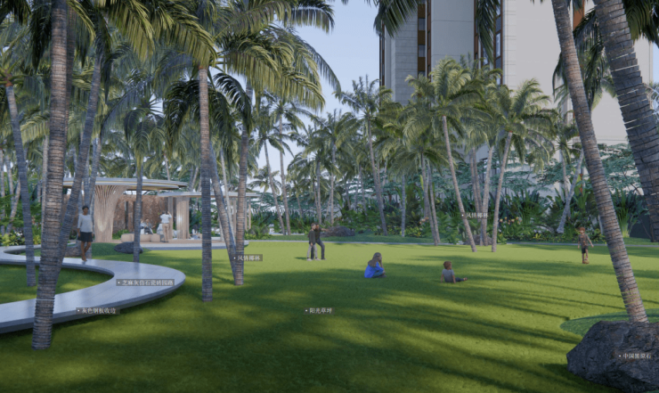 25870㎡社区绿地搭配 37084㎡景观面积,打造 “林与热带、海与海岛、山与涧、浅滩与海岛” 四大主题园景。椰林掩映、绿意盎然,漫步社区如同穿梭在热带秘境,每一口呼吸都饱含鲜氧。