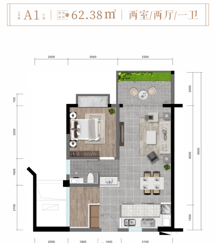 A1户型约62㎡精致两房两厅一卫