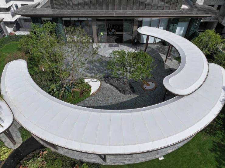 从营销中心出来,就能看到曲线风雨连廊系统,通常只有非常注重品质的项目,才会在园林景观中打造风雨连廊,但多数项目仅采用直线形制,毕竟曲线造型需突破施工精度与成本控制的双重瓶颈。