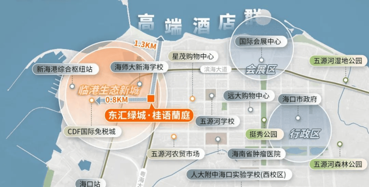 家对面就是全球最大的单体免税城,北接城市口岸新海港,南近海口火车站,更别提附近的海南国际会展中心、五源河文体中心等省级配套。
