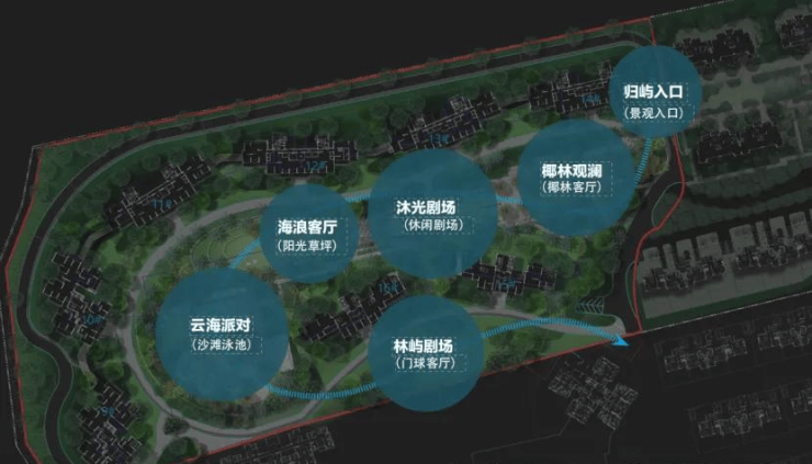 项目社区景观以“林屿” 为主线贯穿园林始终,结合度假生活的需求和海岛的居住文化、自然资源景观等,园林八大主题空间串联,包括椰林嘉观澜,沐光剧场、海浪客厅等场景交织,兼顾功能性和美观性。