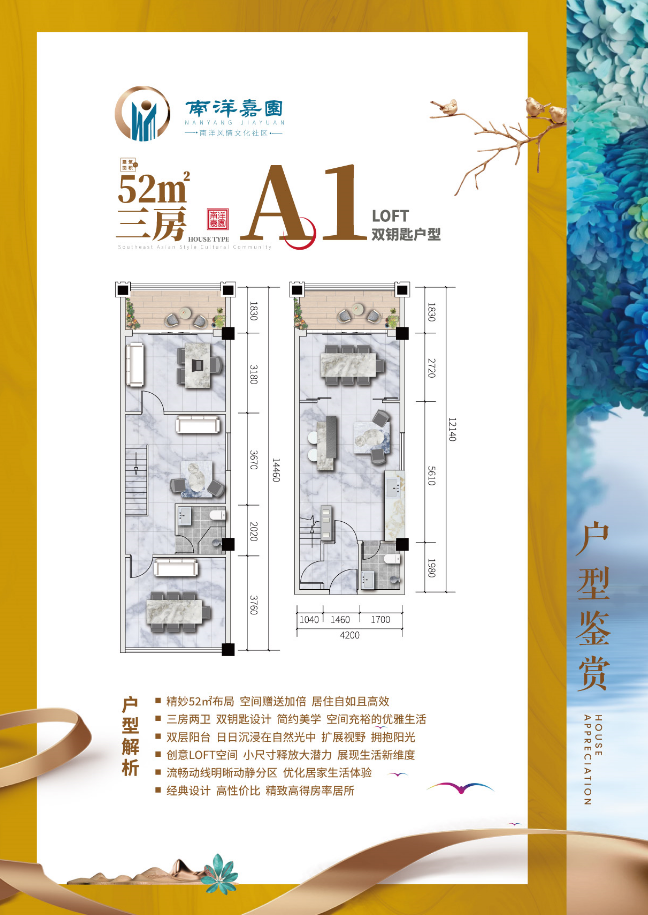 A1户型 双钥匙LOFT 约52㎡ 三室两厅两卫