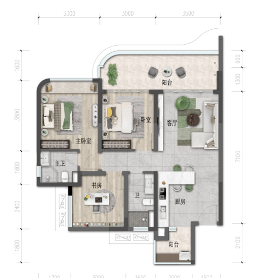 建筑面积约69-104㎡一至三房,方正开阔空间,户户阳台,动静分离,功能分区,厨房、阳台等多功能配套,全能居家,旅居休憩或家庭度假皆可。
