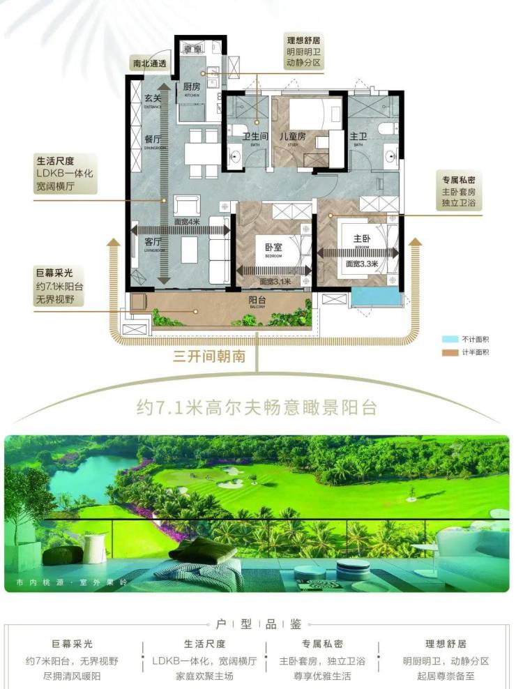 主人房同侧的南向客卧,联通约7.1米的i max巨幕景观阳台。尽管参观的楼层位于较低的二层,但果岭的满屏绿意,仍然让人挪不开眼。