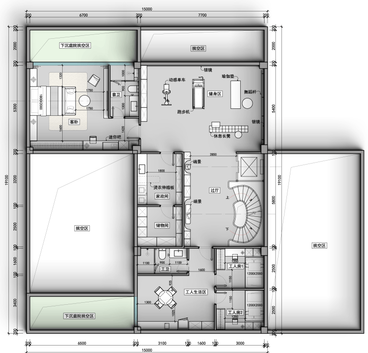 一层户外休闲区、会客厅与餐厅通透相连,庭院泳池波光粼粼,长辈房温馨舒适;二层主卧套房私密尊崇,配备衣帽间与专属卫浴,次卧布局精巧;负一层下沉庭院挑空区设健身区、工人房与储物间,满足多元生活需求;负二层酒柜林立、宴会厅奢阔,私人车库便捷出行,每一寸空间皆为品质生活精心雕琢。