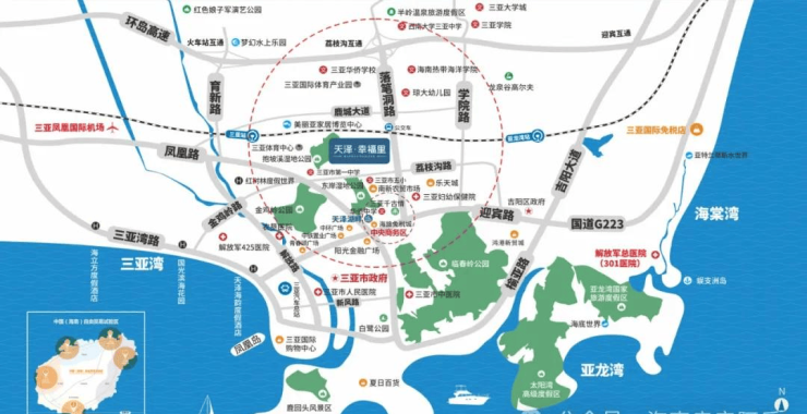 “全省规模最大的三亚市妇幼保健院”距离项目约500米;项目周边有三亚市人民医院、农垦医院、三亚市中医院等“三甲医院”以及解放军425医院,解放军301医院;