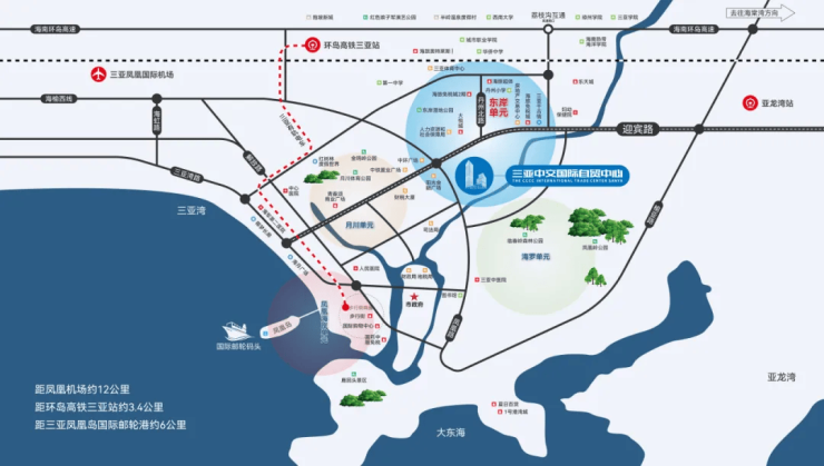 【区位优势】中交国际自贸中心占据迎宾路商务主轴,聚合海陆空立体交通网,地处城市综合体交通枢纽,高效通达全岛。距离凤凰机场约19.5公里,距离三亚高铁站约5.8公里,距离三亚港约8.3公里。