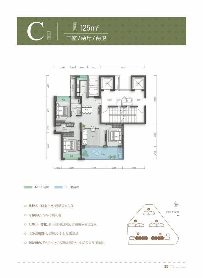 125㎡做3房2卫,入户进来就是餐厅,往里走右侧是厨房,餐客厅相连,进深约8.25米,阳台连通次卧,做到长达约6.9米大阳台,非常大气。