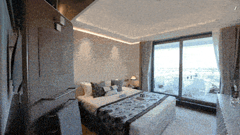 为了呼应游轮度假的空间风格美学,无处不在的弧形元素被运用空间中。突破传统的吊顶营造工艺,项目在客厅和卧室都采用了难度极高的GRG一次成型吊顶工艺,为业主打造出了一个独一无二的曲面圆弧吊顶,让室内空间具有层次感。