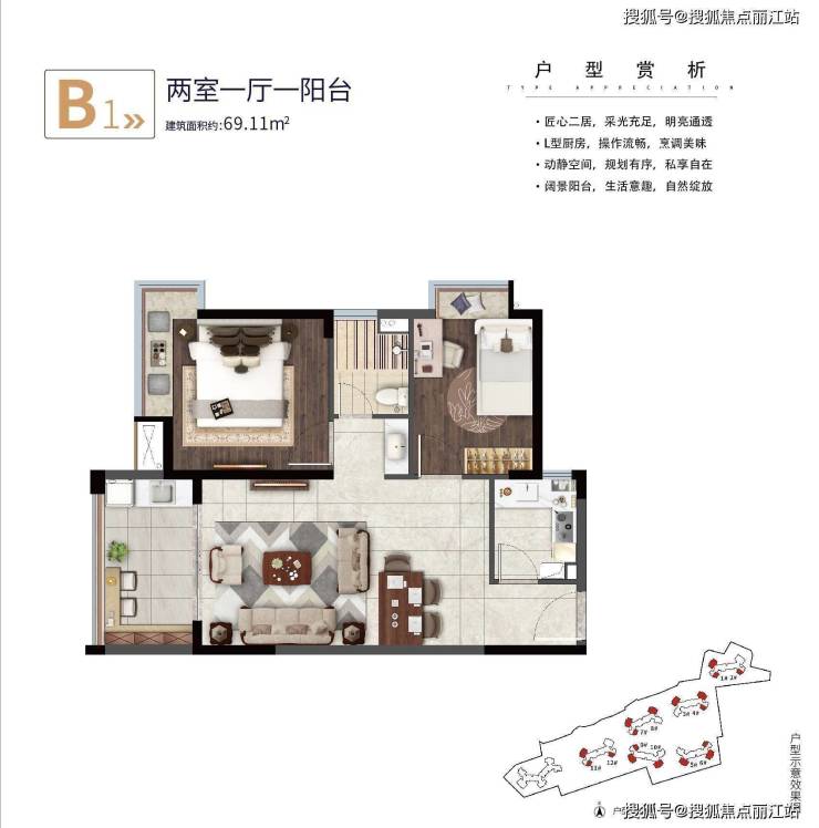 户型介绍:轻巧一居,功能齐全,舒适随意,观景阳台,温馨厨房;