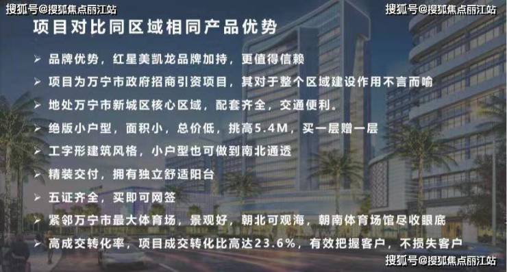 2、项目自带五万平方商业综合体 涵盖高端家居卖场 大型生活超市 餐饮 娱乐等配套 以后将会是万宁人流最大的商场 也将海南东部最大的家居广场 商业往来频繁 交通便利居住需求量大 是投资客户的最佳选择