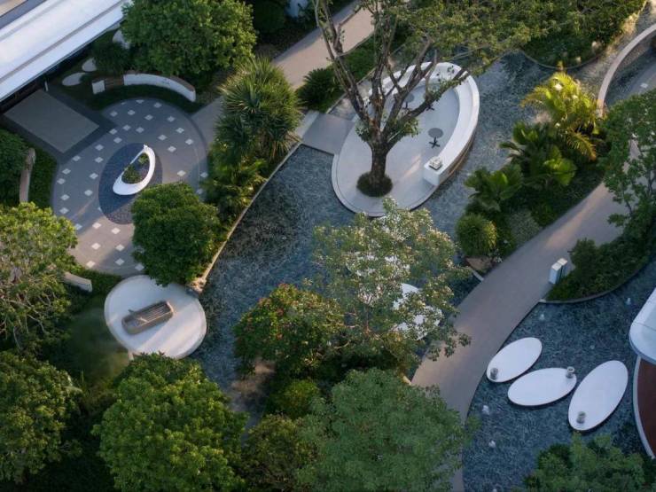 项目建筑密度低于10%,所以拥有足够的空间打造公共区域。设计团队巧妙地将高层建筑的底层架空,并通过风雨廊相连,有效地模糊了空间与自然景观之间的界限。自然形成的底层大花园成为了业主社交的绝佳场所。