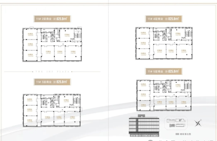 2-4层层高约4.5米,5层层高约4米,每层建面约825㎡,建筑面积段约100-161㎡。