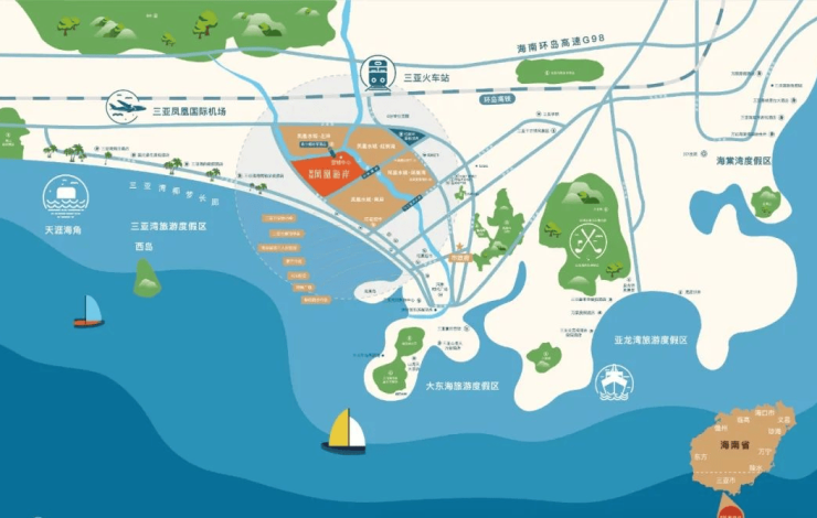 北连河东路、凤凰路,西南紧邻解放路,驾车约8分钟即达三亚高铁站(约3公里),驾车约20分钟即达三亚凤凰国际机场(11公里),驾车约15分钟到达环岛高速G98火车站互通(5.9公里),距离有轨电车水城路车站约1.3公里;