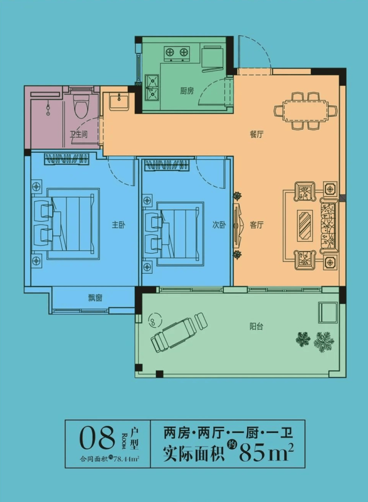 07户型:两房两厅一卫,5.4✖2.4的景观阳台,两卧室全朝阳,客厅开间3.6米