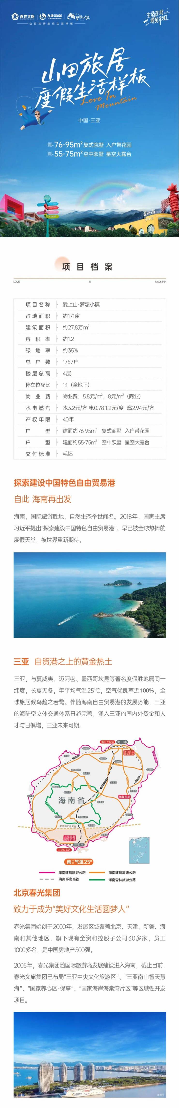1、项目推广名“爱上山·梦想小镇”项目,备案名“槟榔河文旅特色小镇”;开发公司“三亚槟榔河实业有限公司”,预售证号:三房预许字【2020】12号。