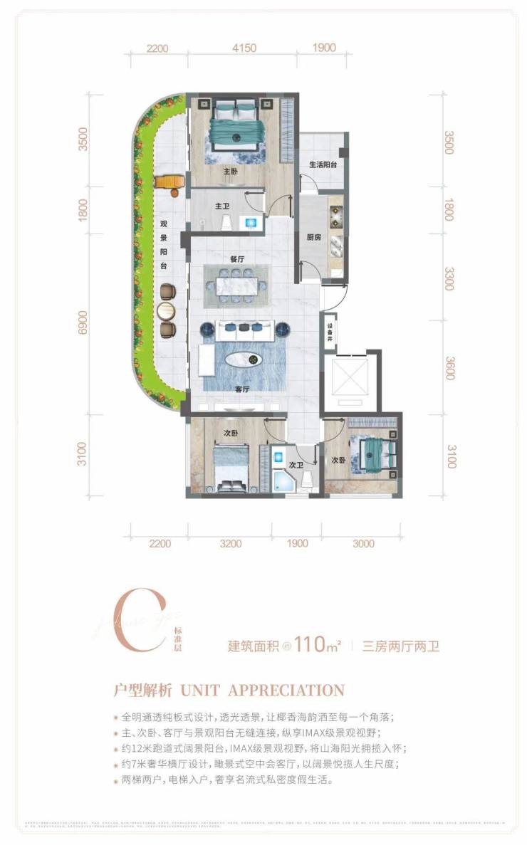 作为景观与房间“承接者”的阳台,其重要性不言而喻。龙栖海岸,约30㎡前后空中花园,进一步赏海天盛景,退一步品山色蓬勃。主、次卧、客厅与景观阳台无缝连接,纵享IMAX级景观视野。