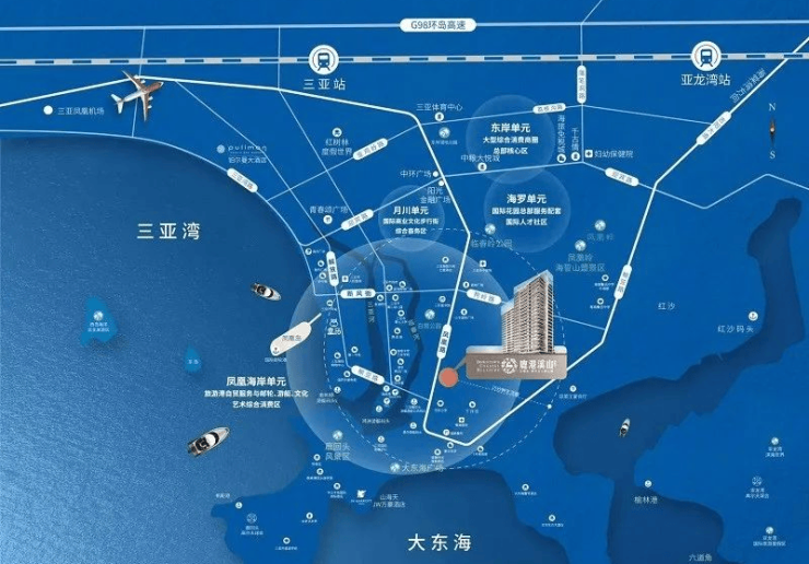 位于三亚凤凰路,紧邻中央商务区,东靠三亚最高峰凤凰岭、南面三面环山的大东海、北面市中心迎宾路、西面三亚湾和大东海双湾的交汇处、门前还有三亚的母亲河:临春河和三亚河。