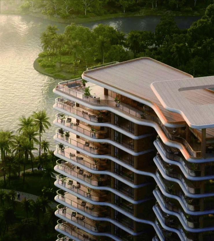 汲取全球滨海奢宅灵感,以现代手法演绎经典:弧形曲线呼应海浪,横向飘板勾勒如海平线般开阔、平稳的观感,营造从容、安宁的“滨海松弛感”。