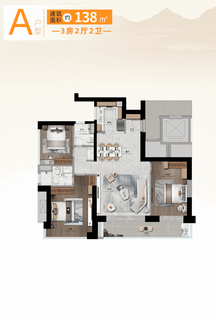 约7.5米的阳台贯穿客厅与次卧,更是足够将窗外的万象城繁景完全融入日常的生活中。
