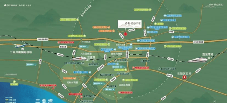 保利·栖山雨茗落址于三亚吉阳区落笔洞路北侧温泉二路,紧邻城市主干道落笔洞路及半岭大道。项目距海南环岛高速荔枝沟互通高速入口约3.9公里,距离三亚高铁站约10公里,距离三亚凤凰国际机场约17km,交通便利,可快速通达全城生活圈。