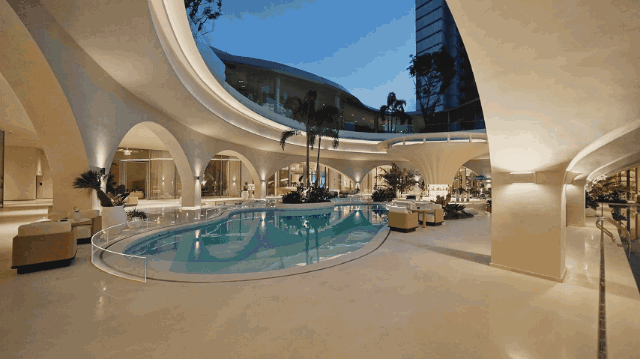 会所的立面采用了白色的曲线拱券造型,泳池从中穿过,蓝白相映,让人感受宁静而放松。作为国内首家使用迪拜风的社区会所,带来同纬度的气候和异域风情感,让住户的体验感再上一个阶层。