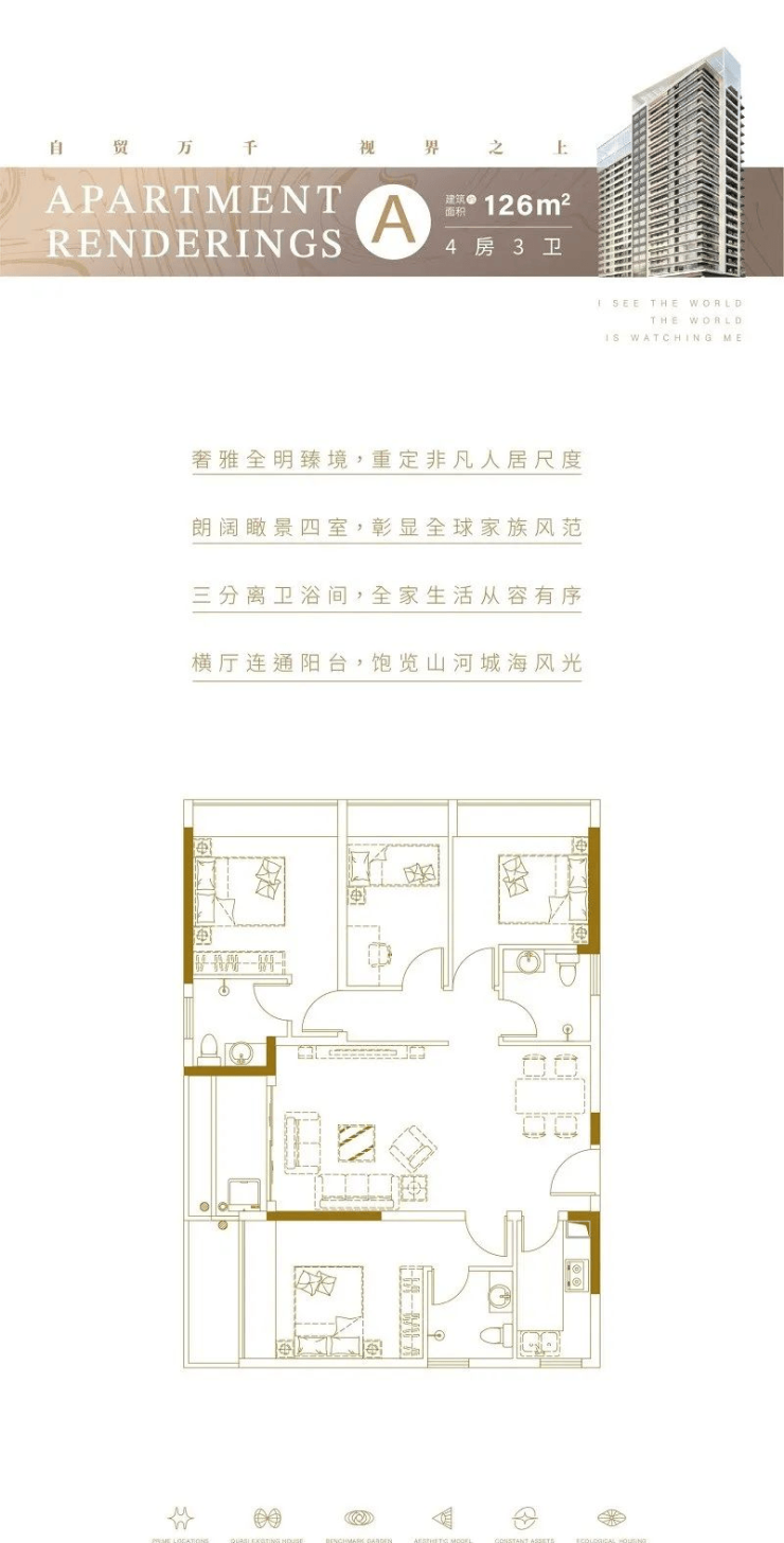 A户型:建筑面积约126㎡,四室两厅三卫。奢雅全明户型,入户玄关处鞋柜设计,生活细节满满的人性化;客餐厅一体化,客厅连同超大观景阳台,整个空间宽阔明亮;L型厨房双灶台设计,预留双开门冰箱,美味随心出;双主卧设置,主卧景观别致,可观看到白鹭公园及三亚湾的景观海景;东向卧室可看到山景及中庭景观;客卫带窗,通风性好。