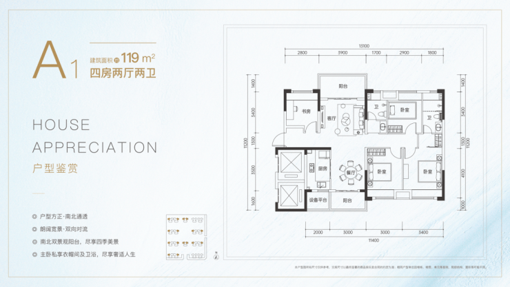 以建面约119㎡A1户型 为例,入户处有收纳功能很强的独立玄关,紧挨着玄关的是次卧,可拿来做书房,也可以做长辈房,再往里走,是餐厅和客厅连通南北双阳台,舒适度相当高。