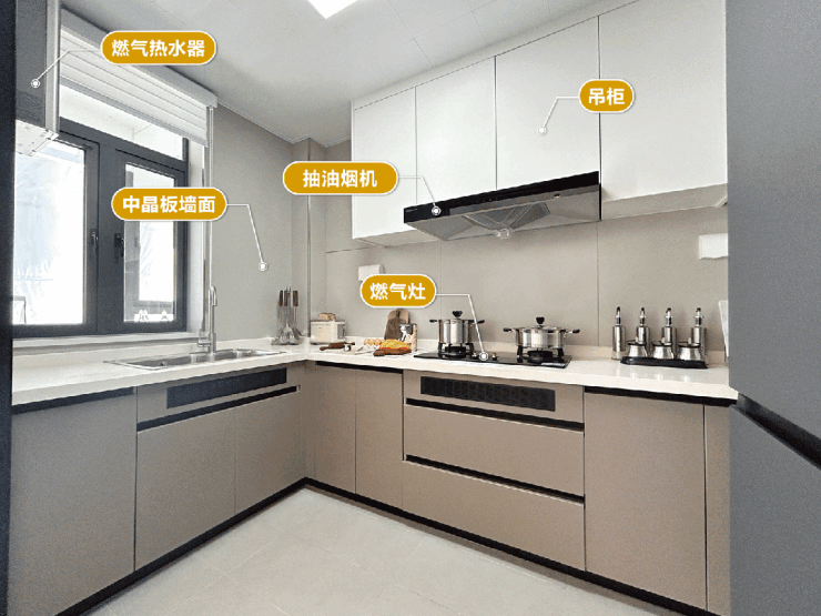比如厨房采用中晶板墙面的同时还增设了吊柜,这个在安居房市场很罕见,令人没想到的是, 卫生间居然还配置了浴室柜 ,这简直就是商品房的标准。