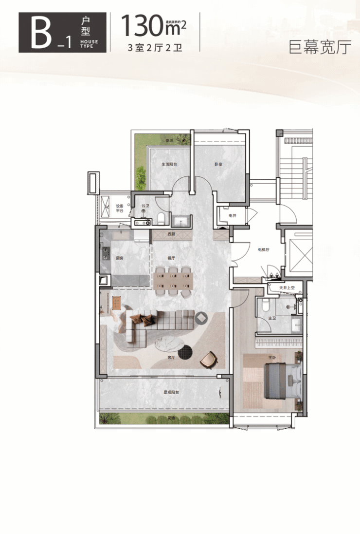 130㎡《巨幕宽厅户型》:南向客厅面宽达7米,进深4米,空间利用率极高。L型厨房与客厅紧密相连,南向直面景观公园带,让每一次家庭聚会都充满自然的气息。