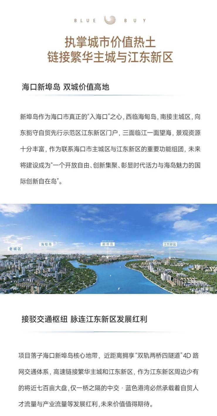 中交·蓝色港湾落子海口市新埠岛中芯地带,作为海口市真正的“入海口”之心,这里西面链接着繁华的海甸岛与主城区,向东扼守自贸先行示范区江东新区门户,三面临江一面望海,作为联系海口市主城区与江东新区的重要功能组团,未来将建设成为“一个开放自由、创新集聚、彰显时代活力与海岛魅力的国际创新自在岛”。