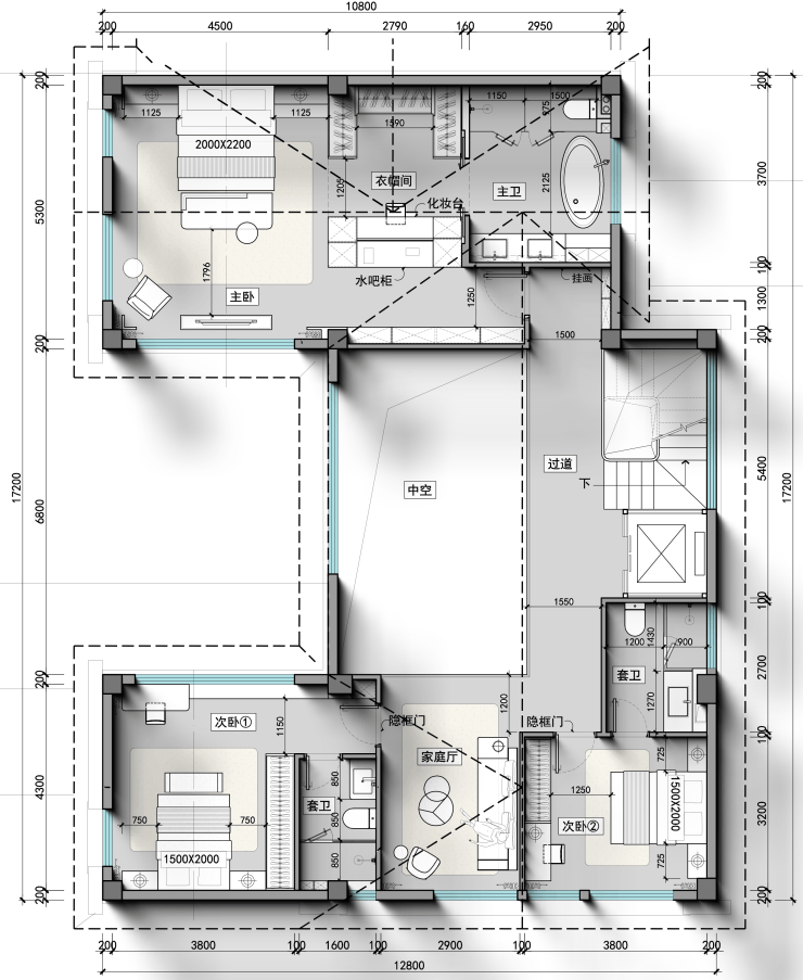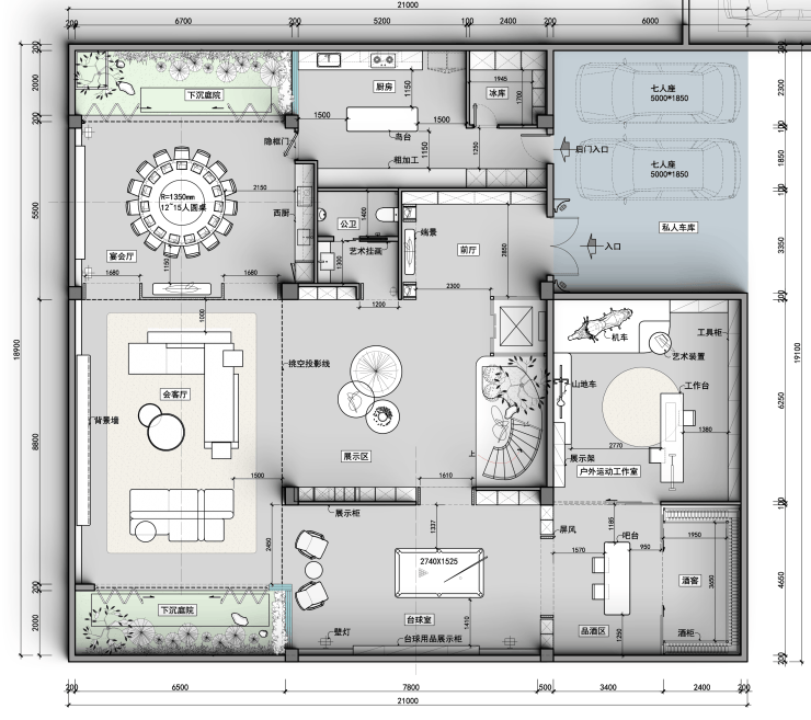 一层户外休闲区、会客厅与餐厅通透相连,庭院泳池波光粼粼,长辈房温馨舒适;二层主卧套房私密尊崇,配备衣帽间与专属卫浴,次卧布局精巧;负一层下沉庭院挑空区设健身区、工人房与储物间,满足多元生活需求;负二层酒柜林立、宴会厅奢阔,私人车库便捷出行,每一寸空间皆为品质生活精心雕琢。