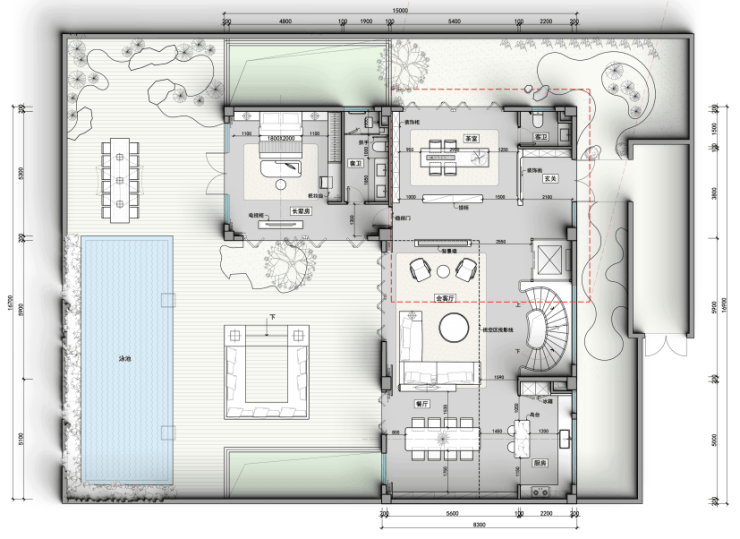 一层客厅与餐厅畅连庭院,泳池景观尽收眼底,长辈房与客卫贴心设计