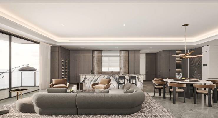 突破传统设计理念,打破同质化/复制化的产品模式,以“海洋灵动曲线”为设计语言,运用石材+铝板+金属+大面积玻璃组合,重新定义海居大平层奢宅。