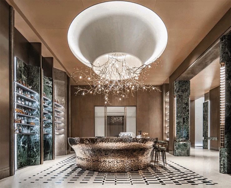 圆形顶部天花与普拉达绿地面石材、景观雕塑相呼应,不仅拉伸视觉维度更彰显出奢华感。