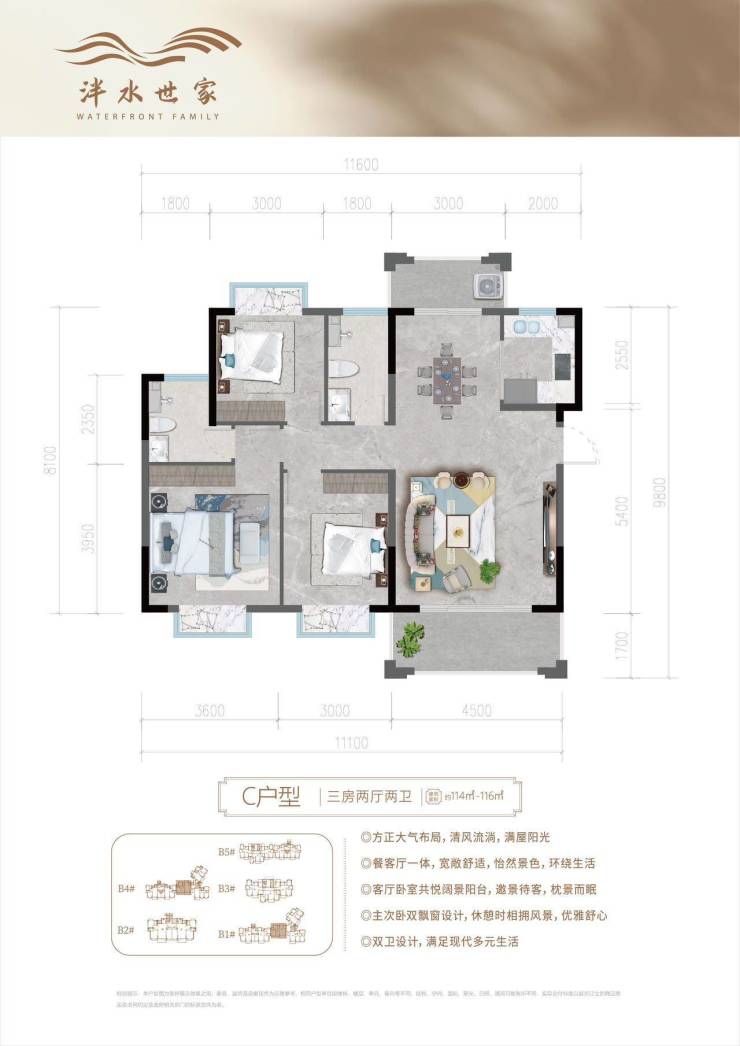 住宅建筑面积约114-122平米 三房两厅两卫