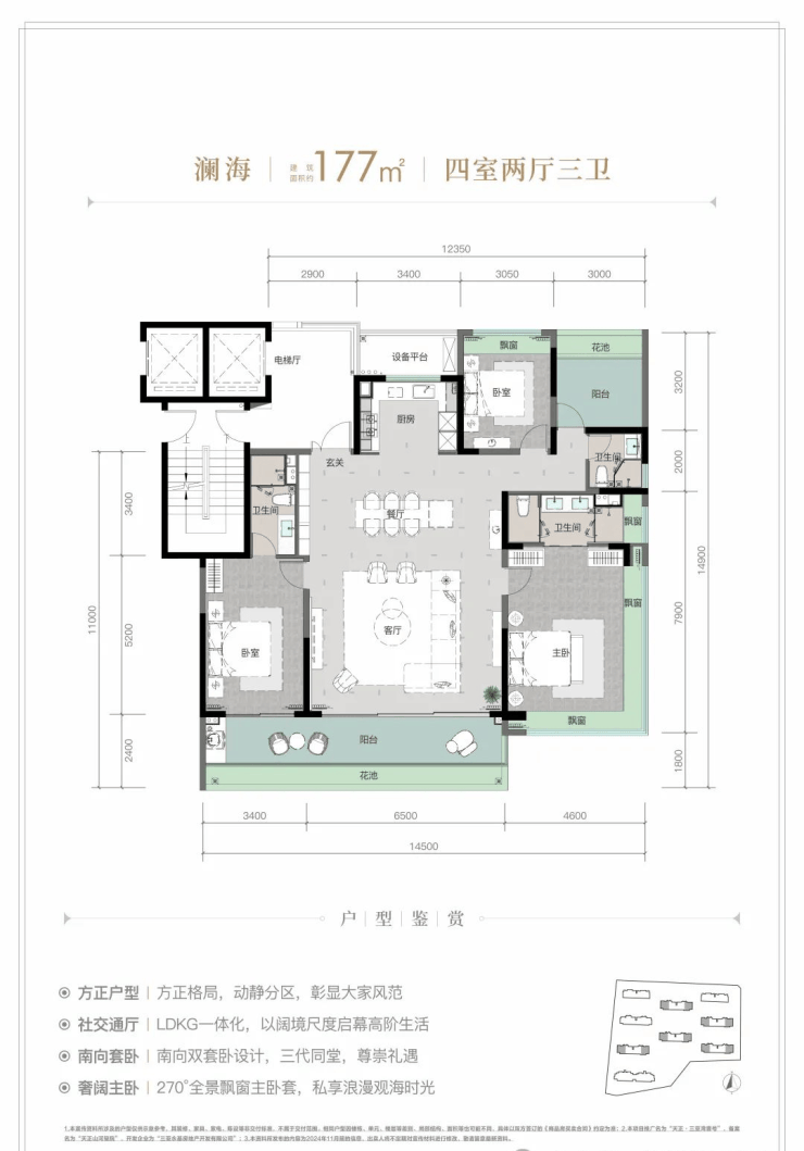 建面约177㎡为四室两厅三卫,真正的奢居产品。